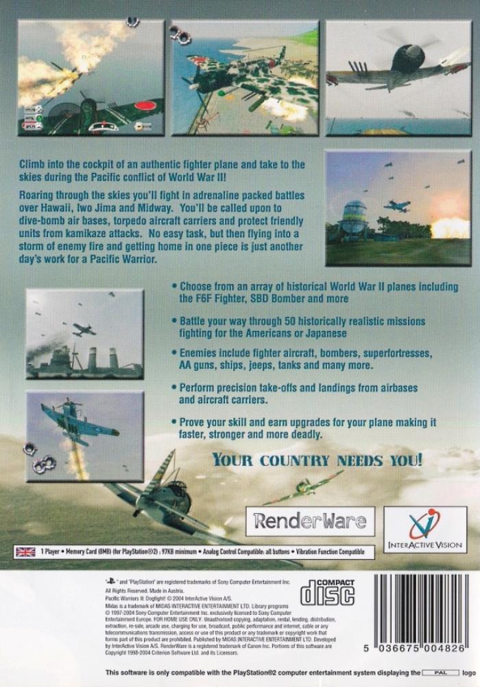 The fate of the world will be decided 10,000 feet above ground and in turbulent waters. In Dogfight: Battle for the Pacific, you'll battle through 50 missions as either an American or Japanese fighter pilot. Missions include defending aircraft carriers, protecting radar stations, and escorting your country's bombers. You must master the controls of the SBD Dauntless, the F6F Hellcat, the Japanese B5N2, and the A6M3. Only your piloting skills can keep you alive as you strafe the war-torn islands of the Pacific.