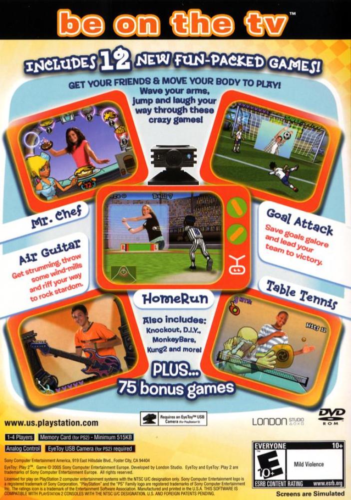 EyeToy: Play 2™ is the amazingly addicting sequel to the groundbreaking original EyeToy: Play™! Experience 12 all new crazy games and 75 bonus games as you block soccer balls, hit homeruns and battle it out for the table tennis crown. Build burgers, chop potatoes, and mash tomatoes as you vie to be the Master Chef. Star in your own kung-fu flick as you battle kung-fu warriors, ninjas and ancient monsters. Catch intruders with the "SpyToy" hidden camera feature and use EyeToy™: Cameo to create interactive 3-D models. With EyeToy: Play 2™, you, your friends and family can all get up and get moving!