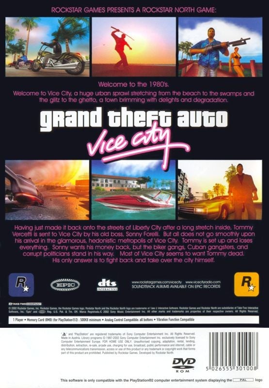 From the decade of big hair, excess, and pastel suits comes a story of one man's rise to the top of the criminal pile. Vice City is a huge urban sprawl ranging from the beach to the swamps and the glitz to the ghetto, and is the most varied and complete digital city ever created. Combining nonlinear gameplay with a character driven narrative, you arrive in a town brimming with seedy opportunities and are given the chance to take it over as you choose. Take control of a variety of vehicles including high-performance cars and motorbikes, powerboats, golf buggies and helicopters. Browse through the radio stations, with styles ranging from rock to electro to find a sultry melody or pumping beat to suit your mood. No matter what type of man you are, Vice City is always full of surprises.