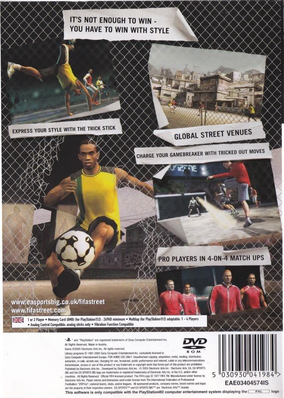 FIFA Street is a combination of arcade action blended with the culture of freestyle street soccer. By removing the rules from the simulation soccer experience, FIFA Street exposes the heart of the world's beautiful game, on-the-ball flare and individual style. Leading this movement are the worlds top professional players, showing off their skills and individual style in 4-on-4 match-ups against the backdrop of global venues that represent the true culture of street soccer. As the first game to support dynamic 1-on-1 encounters, beating your opponent will require skill, technique, and the careful selection of specific moves. As a gamer you'll take on the best and be required to earn their respect, gradually building your reputation and team into an unstoppable force that leads the tide of street soccer.