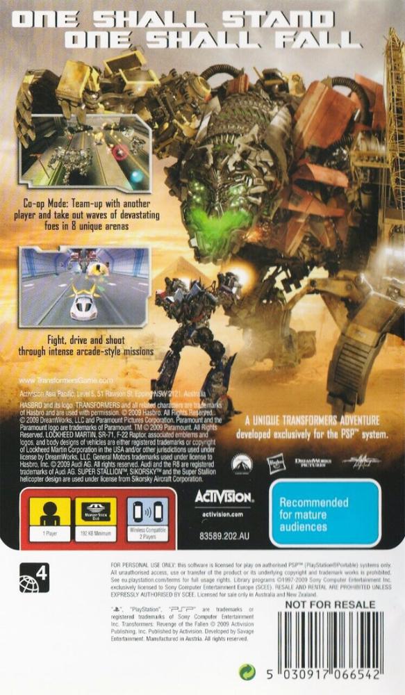 Based on Hasbro's legendary Transformers property and the highly anticipated blockbuster film, Transformers: Revenge of the Fallen thrusts players into a battle for supremacy across the globe as either Autobots or Decepticons to drive, fly, fight and blast their way through intense, pressure-packed levels. Delivering more control than ever before, players can select from an extremely diverse range of playable Transformers - each with distinct personalities, abilities and weaponry - and jump straight into action as they instantly switch between robot, vehicle and weapon modes to fight for the preservation or annihilation of all mankind. For the first time in the Transformers universe, players can also fight the epic war between the Autobots and Decepticons online in explosive, multiplayer combat.