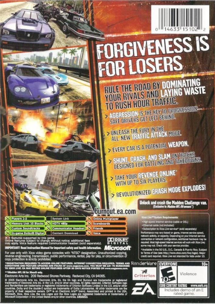 Burnout Revenge is a racing game in which your desire for destruction is as important as your ability to reach the finish line. The sequel to Burnout 3 adds some new features such as detailed car damage, crash combos, and a meter that rewards vengeance on the road. Game modes run the range from pure racing to pure destruction on a handful of real-world locations, including Detroit and Rome. Burnout Revenge also supports online play for challenging other players.