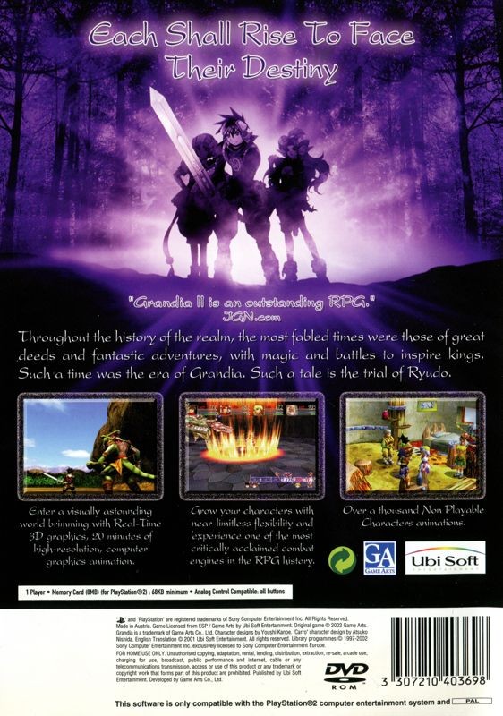 The sequel to Grandia puts you in the role Ryudo, a young bounty hunter who travels the lands looking to sell his sword to the highest bidder. With your hawk friend Skye, you'll embark on a journey filled with puzzles, battles, and thousands of characters. In order to survive the battlefields of Grandia II, you'll need tactics, skills, and technique. Unleash the hero within and face your destiny as you defeat enemies across expansive 3D landscapes.
