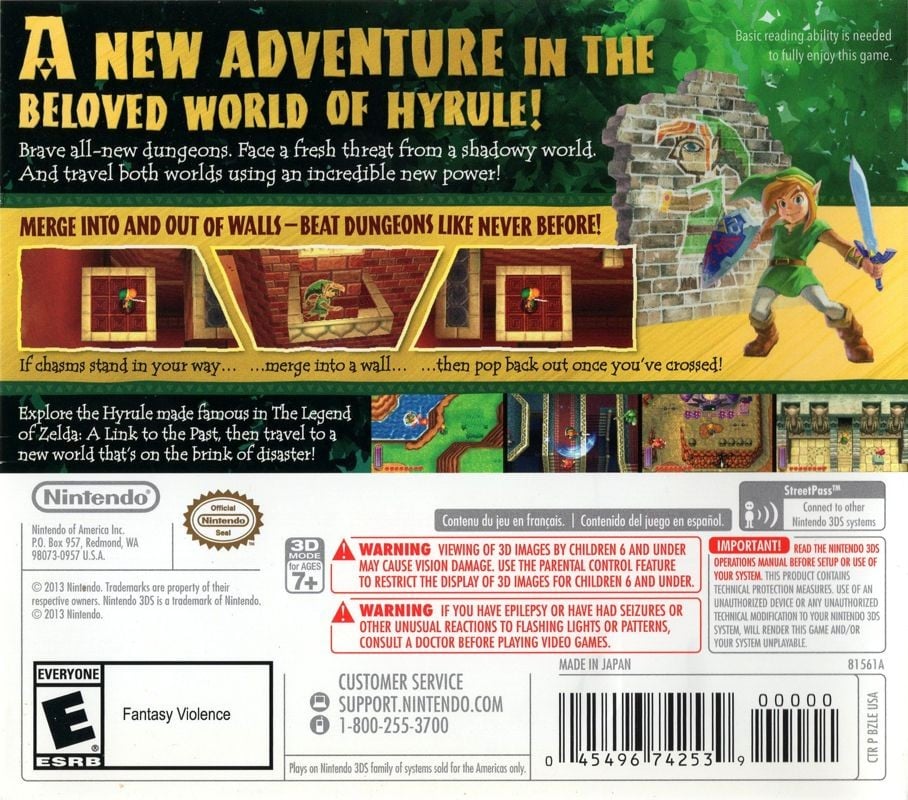 Two worlds collide in an all-new adventure set in the world of Super NES classic The Legend of Zelda: A Link to the Past. In this newly spun tale, Link transforms into a living painting to cross into a dark, parallel dimension mirroring Hyrule. Conquer the puzzles, traps, and hidden rooms of deadly dungeons to save both worlds from certain doom!>