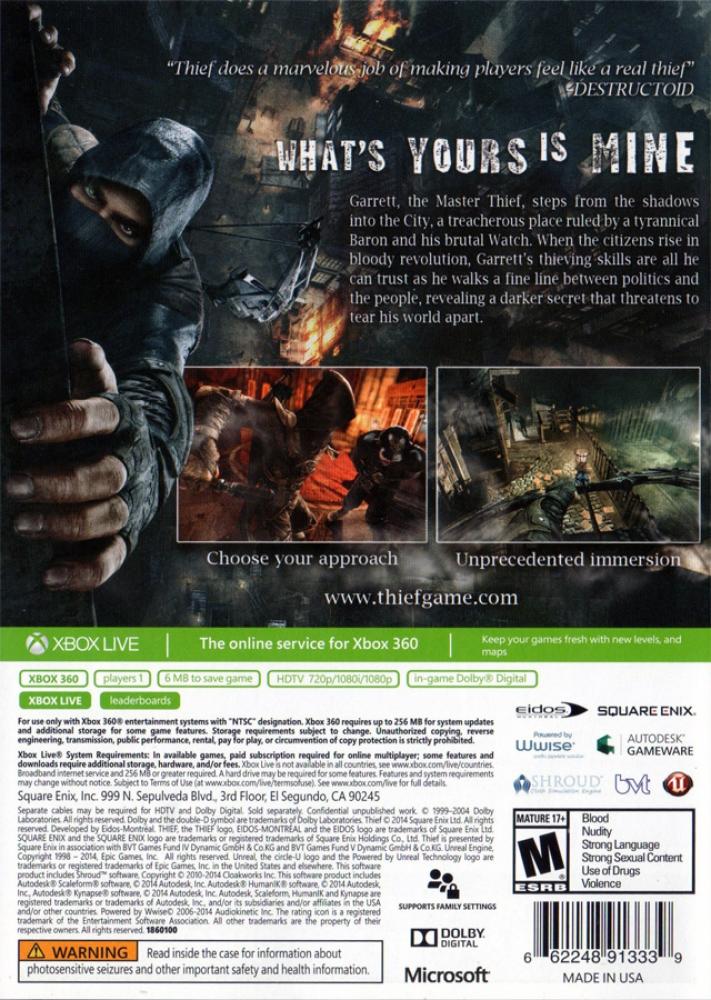 Garrett, the Master Thief, steps out of the shadows into the City. In this treacherous place, where the Barons Watch spreads a rising tide of fear and oppression, his skills are the only things he can trust. Even the most cautious citizens and their best-guarded possessions are not safe from his reach.