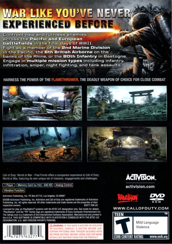 Developed exclusively for the PlayStation 2 computer entertainment system, this game offers a companion experience to Call of Duty: World at War, featuring its own unique set of missions, engagements and challenges that are set within the Pacific and European campaigns through many of the pivotal battles that led to the end of the world's greatest war.