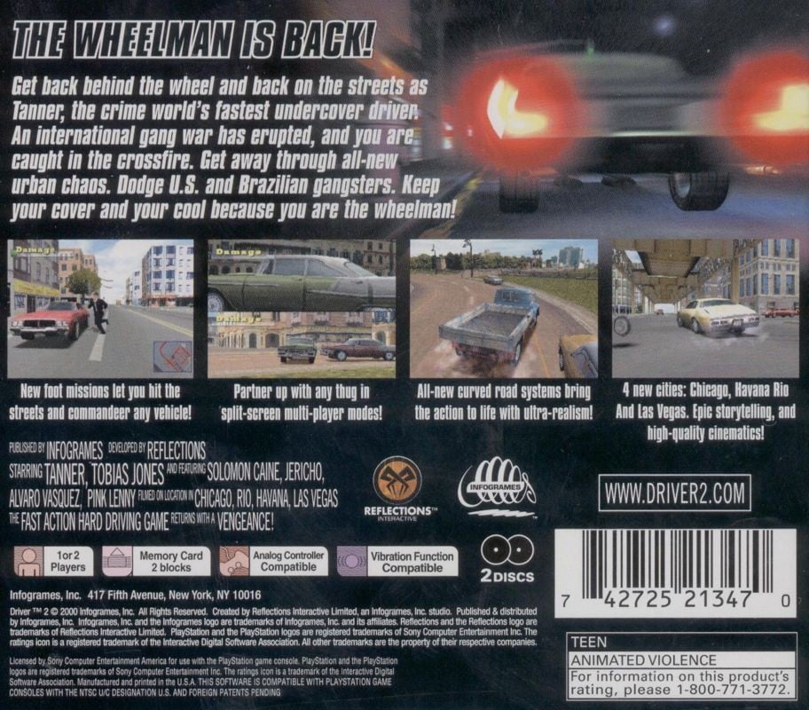 The crime world's fastest getaway driver is back on the streets in Driver 2, the sequel to the action-packed Driver. Like its predecessor, Driver 2 is an adrenalin-fueled, high-speed car chase through the streets of four cities, where you, as Tanner, infiltrate the criminal underworld, using your driving skills as well as your cunning to disrupt their plans. All the true-to-life features of Driver; such as realistic car handling, complete with damage modeling and true, real-world physics reactions on all cars; extensive production, giving the cities an amazing realism, featuring recognizable landmarks; new features such as foot missions, dual player, and the enhanced cut scenes make this game a real adrenalin rush.