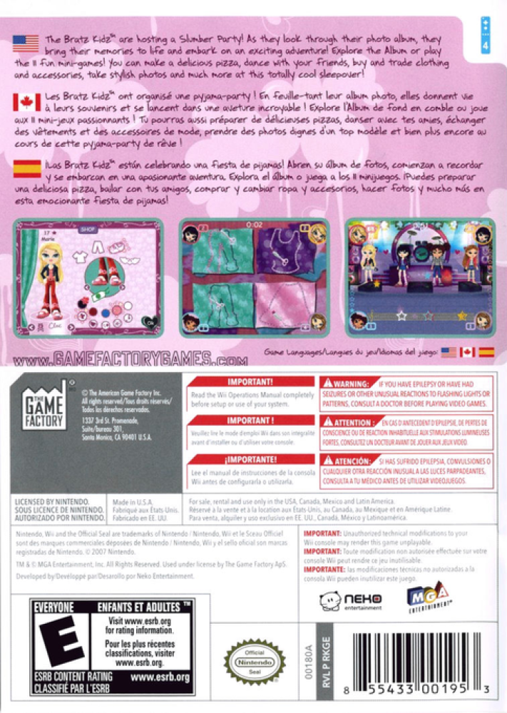 Bratz Kidz Slumber Party features 15 fashion and beauty mini-games set in a slumber party environment and is designed for girls ages six and older. Players can choose from and customize any of their favorite Bratz Kidz characters, as well as design their own bedroom. With multiplayer capabilities, Bratz Kidz Party allows players to compete against each other using the platform's wireless connection.