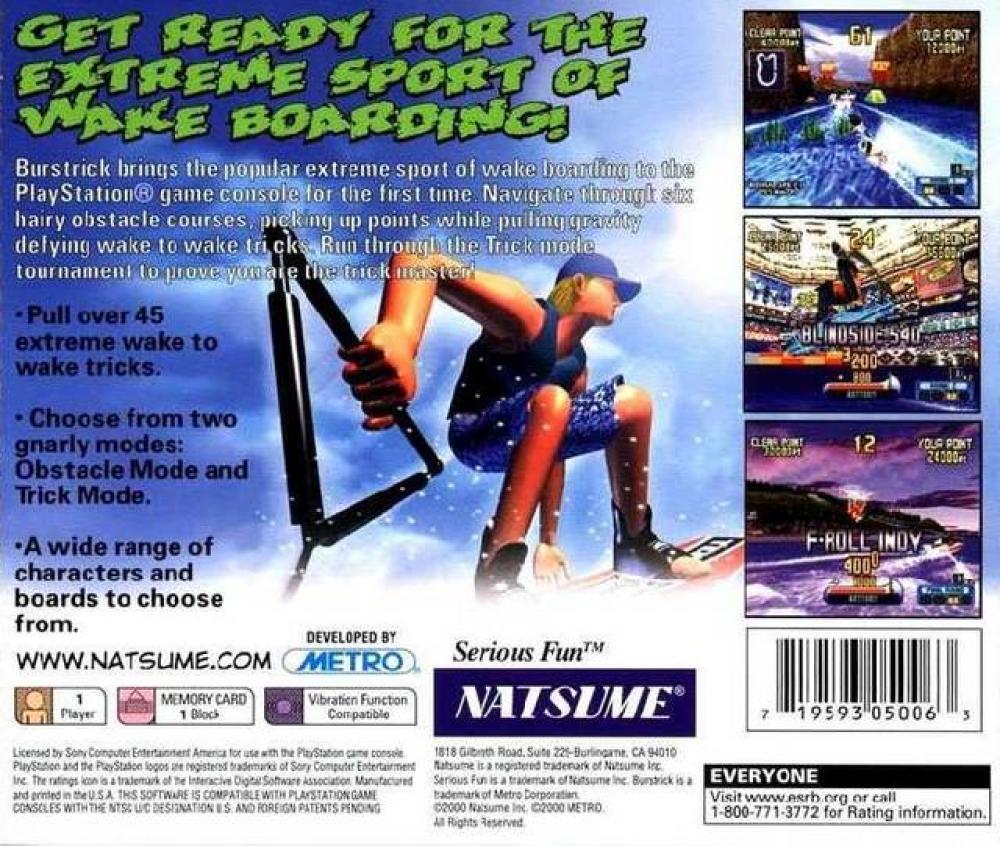 Burstrick brings the popular extreme sport of wake boarding to the Sony PlayStation game console for the first time. Navigate through six hairy obstacle courses, picking up points while pulling gravity defying wake to wake tricks. Run through the Trick mode tournament to prove you are the trick master!