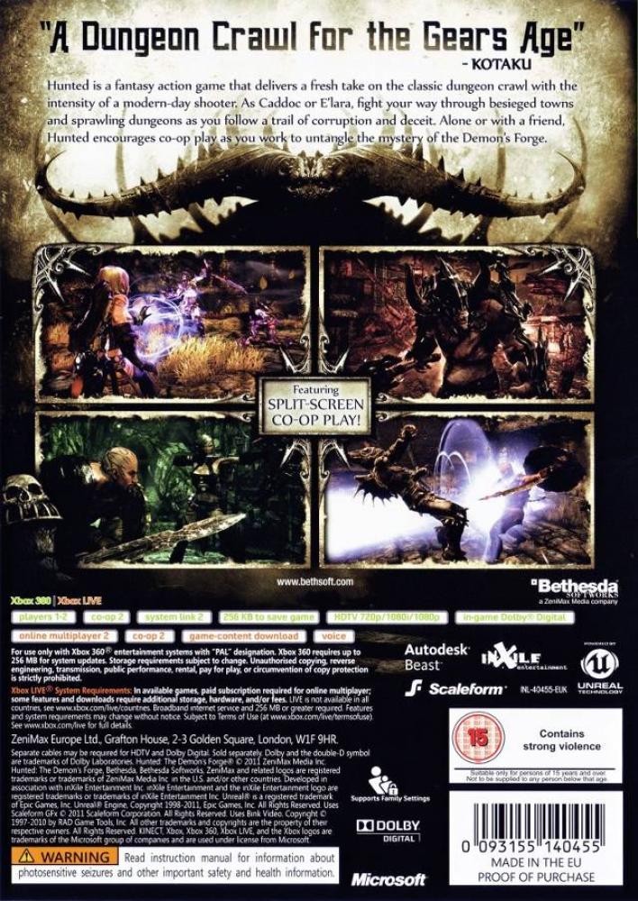 Set in a dark fantasy world, Hunted: The Demon's Forge is an unforgettable cooperative action game, pitting you and your partner against waves of vicious enemies. Taking control of either E'lara, a ranged weapon expert, or Caddoc, a master swordsman, you must use a variety of weapons, powerful spells, and cover tactics to battle your way through menacing dungeons, overgrown ruins, and downtrodden towns. Discover secrets and complete co-op-based puzzles whilst exploring the sinister world to discover answers to the game�s deep, dark mysteries. The dark ages have become corrupted. Heinous creatures have emerged from underground. Townsfolk across the land are disappearing. Upon the promise of their fortune in gold, mercenaries E'lara and Caddoc take on the daunting task of discovering where the innocent villagers have been taken. Their journey will lead them on a dark and twisted path where they will encounter death, slavery, and sacrifice. Travel deep within the world of Kala Moor...and to the secrets of The Demon's Forge.