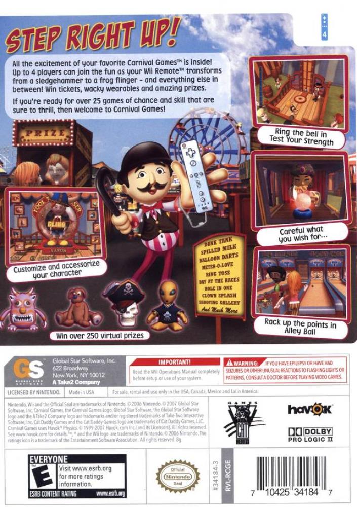 Carnival Games feature 25 popular games from classic carnivals, including Clown Splash, Milk Can Toss, Nerves of Steel, Lucky Cups, Hoops, Day at the Races and Dunk Tank. Players can win over 250 upgradeable prizes ranging from a goldfish to giant stuffed animals. Character-customizing items like a pirate's wardrobe and a Viking helmet are also there to be won. The game features a fortune teller who reveals a player's fate for a price.