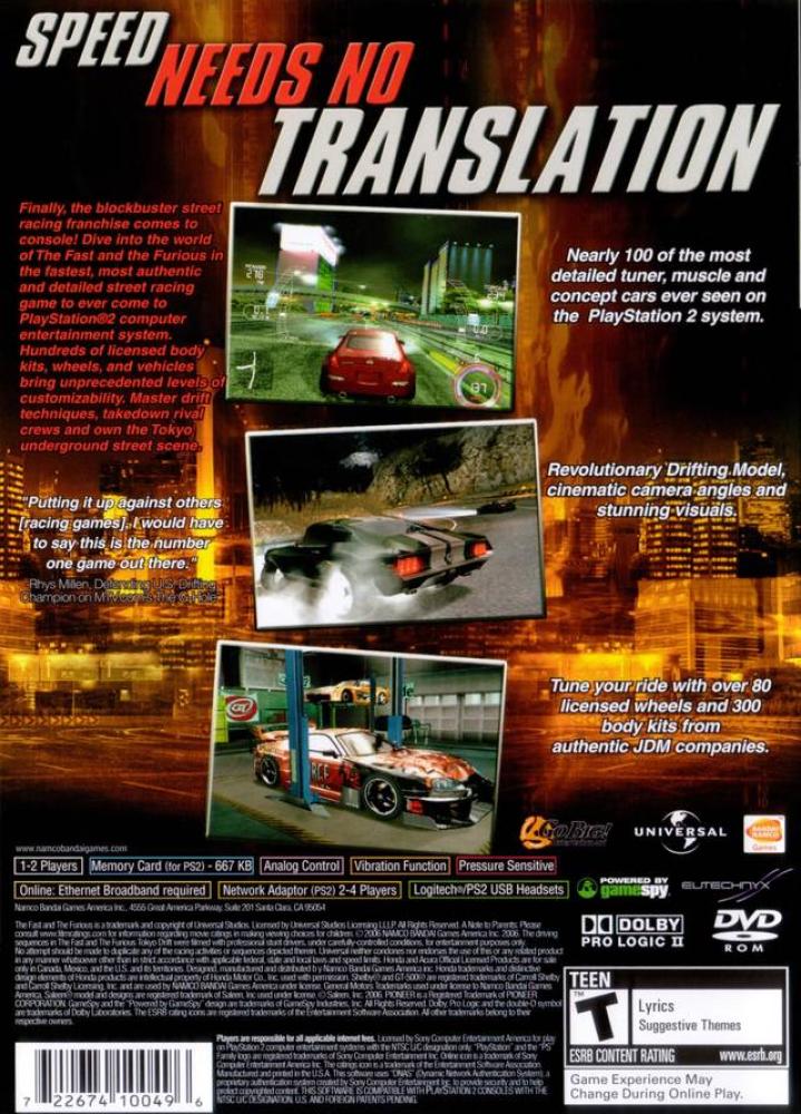 Inspired by the events of Universal Pictures' upcoming film, "The Fast & The Furious: Tokyo Drift," this game immerses players in the underground world of drift racing. Set in a world related to, yet separate from, the movie, the game features a drift mechanic that makes drifting accessible to both beginning and veteran racing game drivers. Gameplay features revolutionary new systems like the Drift Indicator. Turn on the assists and feel like a pro, or turn them off and hone your drift skills. Focusing on the "next big thing" in underground street racing this video game utilizes Universal-s extensive sound library, an incredible context based camera code, a revolutionary context based rumble system that gives players the feeling of driving city streets at break neck speeds like no other. Immerse yourself in the world of the game. 10,000+ polygon model cars, cinematic camera angles straight from the movie, unique boss challenges, stunning visuals and an Advanced Rubber Band AI system. Tune your ride with a hundred licensed wheels, and over 500 body kits from real JDM companies. Tune your ride like never before from performance to appearance, and for the first time ever swap out your engine to truly push the limits of your vehicle.