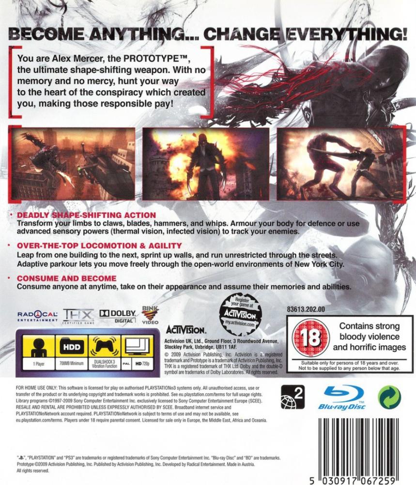 Discover what lies beyond the edge of evolution. An all-new, 3rd person open-world/action game, Prototype puts gamers at the helm of Alex Mercer - a genetically mutated shape-shifter with no memory of his past hell-bent on solving the mystery of his existence - as he tears through a densely populated New York City moving with Parkour-style fluidity and consuming anybody that gets in his way... assuming their physical identity, memories and abilities.