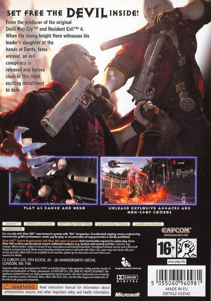 Devil May Cry 4 immerses gamers in a gothic supernatural world, where a new protagonist clashes with a familiar hero. As the new leading man, Nero, players will unleash incredible attacks and non-stop combos using a unique new gameplay mechanic, his powerful "Devil Bringer" arm. Dynamic action and undeniable style combine with explosive fighting options and a gripping story to produce the incomparable experience that only a Devil May Cry game can deliver.