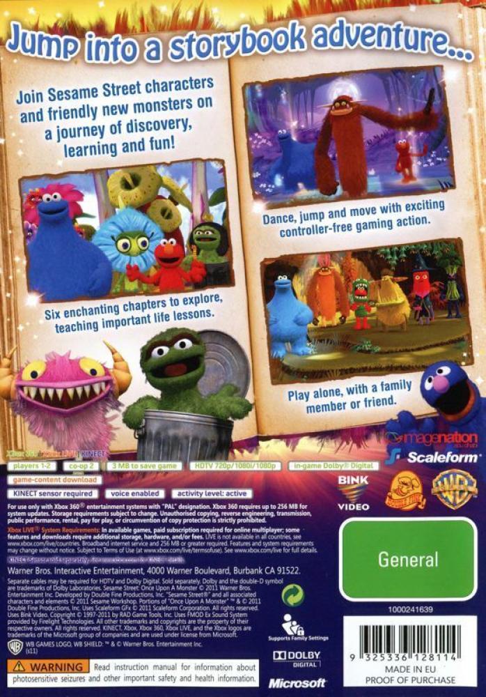 Sesame Street: Once Upon a Monster is an uplifting and funny, family adventure game playable on Kinect for Xbox 360. Players join favorite Sesame Street characters Elmo, Cookie Monster, Oscar, Grover and all new characters as they discover a long lost children's book titled Once Upon a Monster. As they read, they join the action to become part of a living storybook adventure, helping new monster friends with their problems by exploring the book chapter by chapter, page by page. It features active co-op gameplay that is specially designed for sibling and/or parent-child co-play; and teaches social, emotional, and other important life lessons through its colorful and whimsical gameplay.