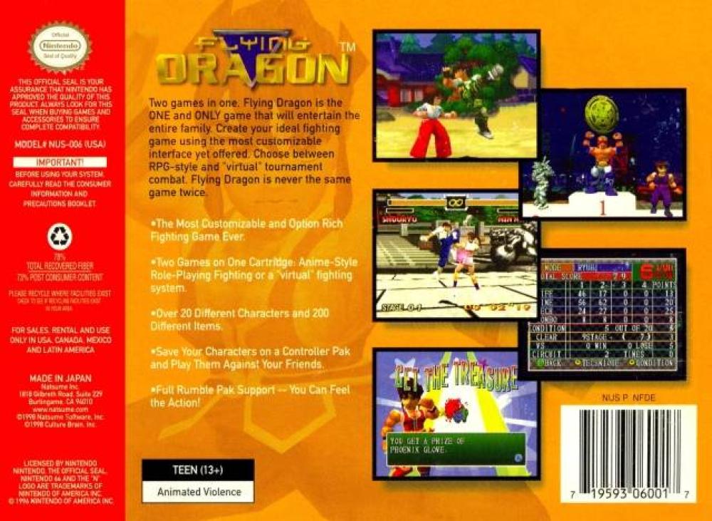Two games in one: Flying Dragon is the ONE and ONLY game that will entertain the entire family. Create your ideal fighting game using the most customizable interface yet offered. Choose between RPG-style and "virtual" tournament combat. Flying Dragon is never the same game twice! Over 20 different characters and 200 different items. Save your characters on a Controller Pak and play them against your friends!