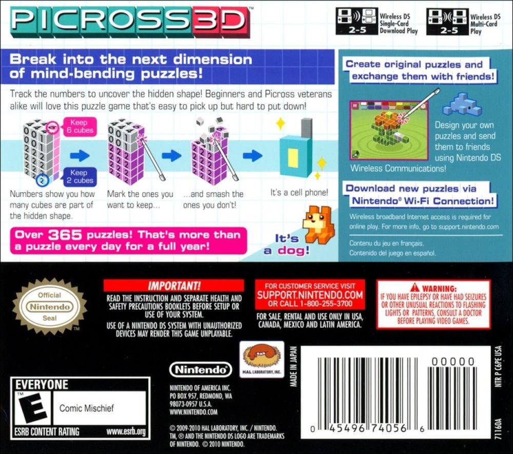 Based on the international smash-hit Picross puzzle phenomenon, Picross 3D takes the mind-bending fun into the next dimension. Blending the logical challenge of a number-based puzzle with the excitement of discovering the hidden objects, this game is easy to pick up, but hard to put down.