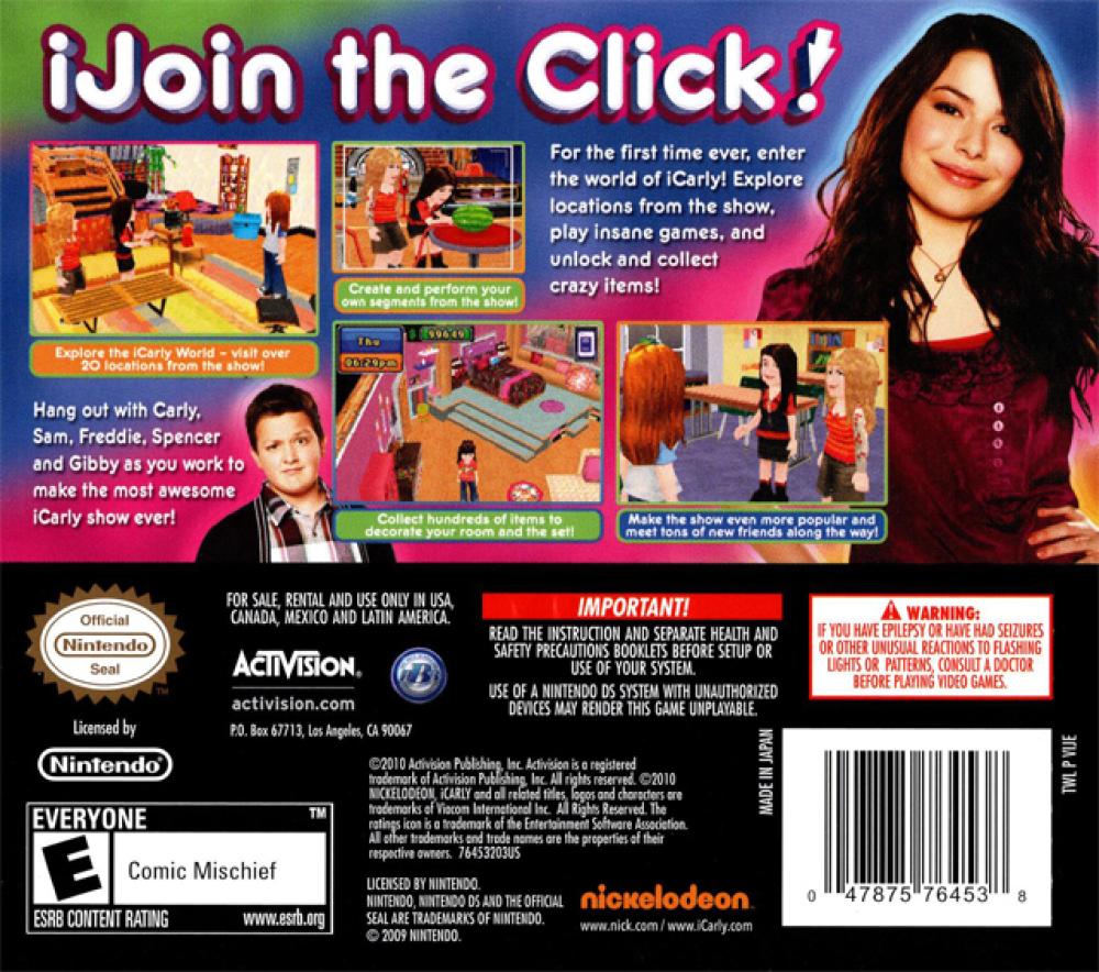 In iCarly 2: iJoin The Click!, the adventure starts with the player as a newbie student at Ridgeway who begins to hang out with Carly, Sam and Freddie at locations from the show, such as Groovie Smoothie, the Pacific Place Mall, and even Carly's apartment. While exploring the locations and interacting with the cast, players get to compete in a series of fun challenges and mini-games to help out the gang. Carly wants her webisodes to become an even bigger sensation, so they need the player's help in LIVE in 5! Mode by choosing props for the set, adjusting the crew, and making sure the show goes off without a hitch. For those with a Nintendo DSi, the game takes advantage of the system's built-in camera to let the player take shots and import images to customize her look and wardrobe in true iCarly style.