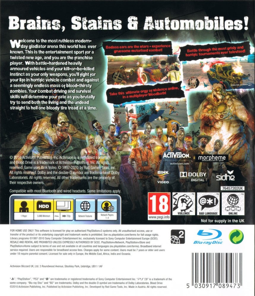 In Blood Drive, contestants must use their motorized death steeds of steel in a televised game show where drivers battle each other and hordes of revolting flesh eaters in an all-out fight to the death. Face undead frat boys, cops, strippers and bachelorette partiers, each with their own special brand of death and devastation - and ways to die! While these rotting monsters wander the streets of a desert sin city craving sweet, succulent brains, your enemies have come equipped battle hardened armed vehicles, including heavily weaponized muscle cars, hot rods, and more. Amidst this gore-drenched mayhem contestants must use their head or lose it!