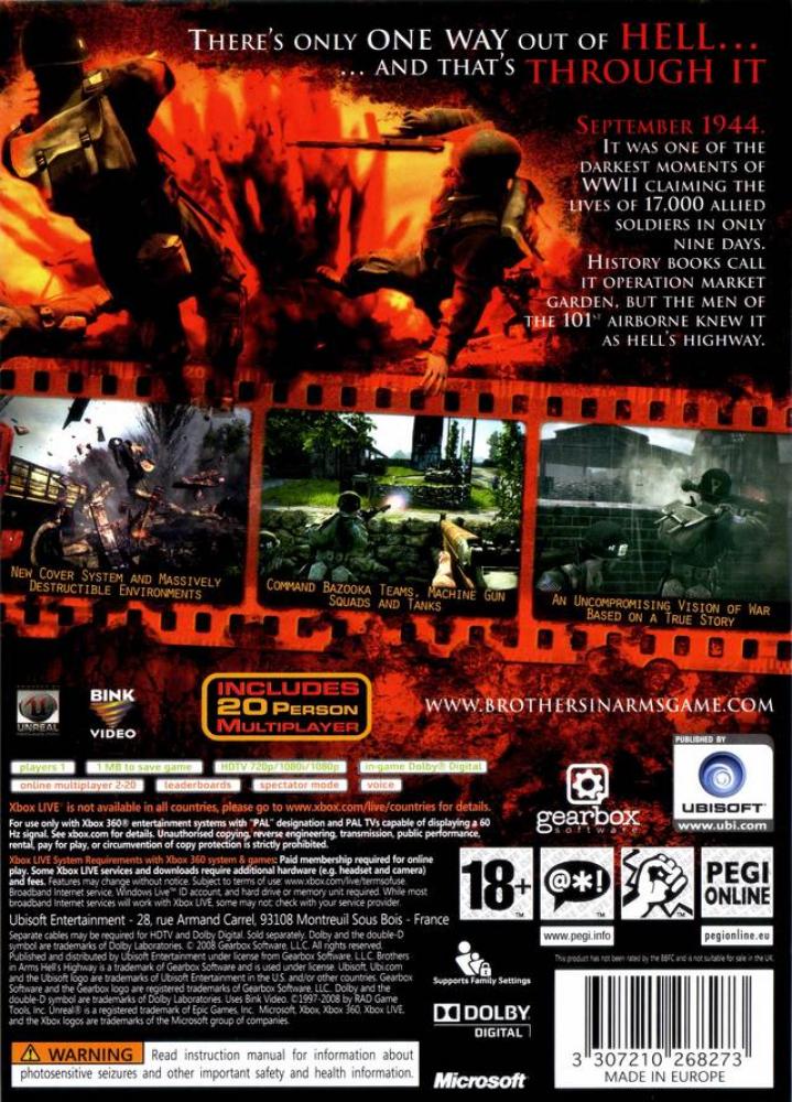Brothers In Arms Hell's Highway brings the critically acclaimed squad-based WWII shooter into the next generation of gaming with amazing graphics and sound, new cutting-edge gameplay features, and a totally redesigned online component. Delivering on the franchise's compelling story, unrivaled authenticity and intense squad-based action, Brothers In Arms Hell's Highway drops you into Operation Market Garden, the largest paratrooper operation in World War II. Lead Matt Baker, Joe Hartsock and the rest of the 101st Airborne Division as they fight to open "Hell's Highway" in a daring bid for a quick end to the war.