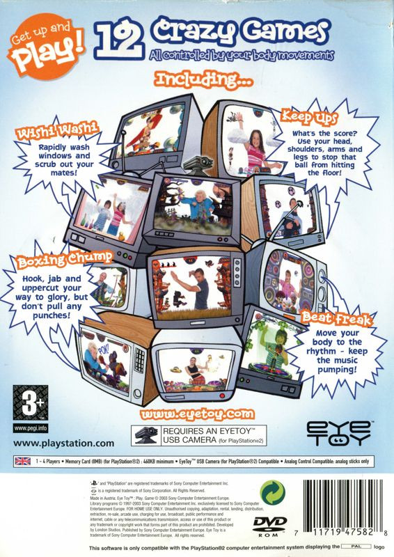 A cool new gaming idea needs some cool games to play on it. So have a look at EyeToy: Play, the first game made exclusively for EyeToy, a motion sensitive camera that sits on top of your TV and plugs into your PlayStation 2. EyeToy: Play is a collection of 12 addictive games. With Kung Foo, puzzles, dancing, juggling, football, boxing, fireworks, and loads more, there are enough games here to keep you all laughing at each other for hours. And the best part is, anyone can play.