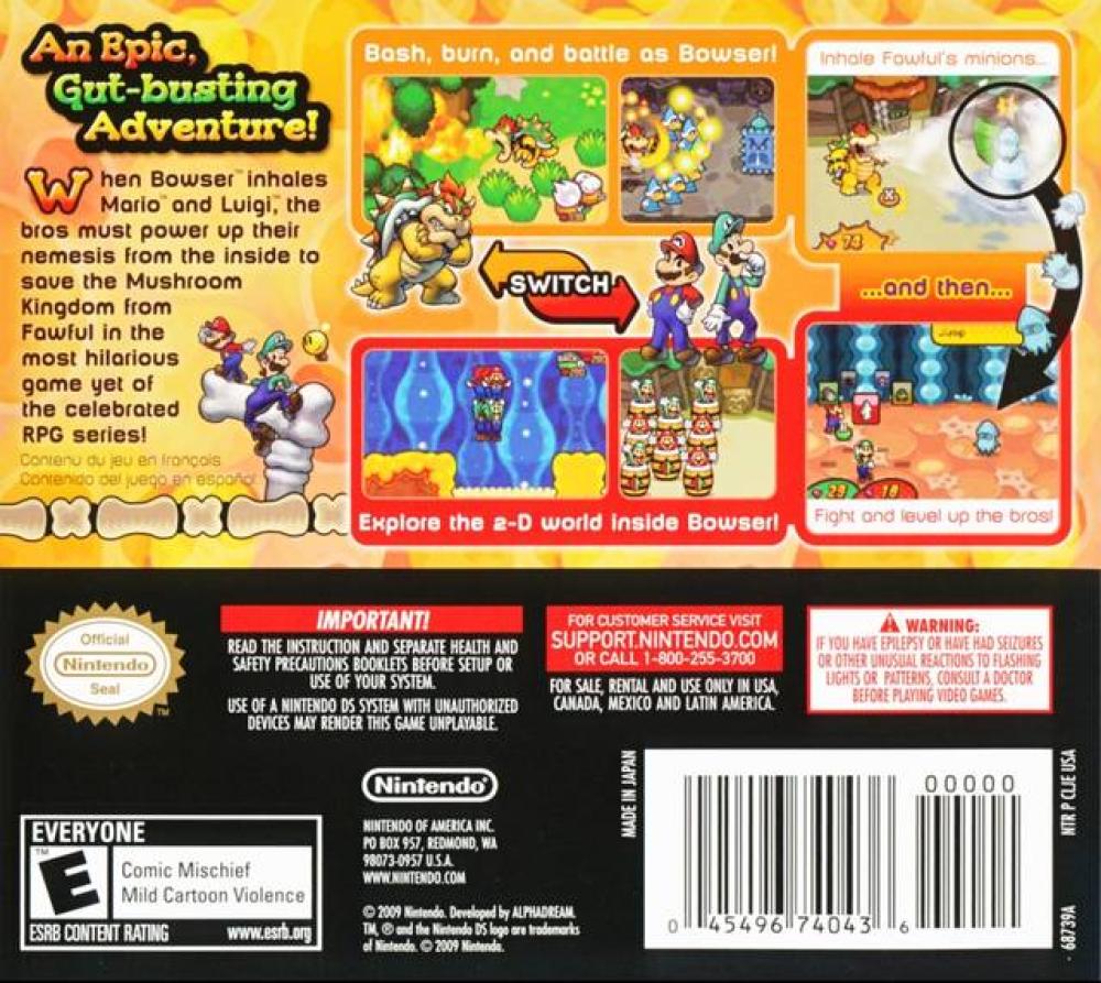 In his evil plot to take over the Mushroom Kingdom, Fawful tricks Bowser into eating a magic mushroom. The mushroom causes Bowser to begin inhaling everything around him, including Mario, Luigi and Princess Peach! Do the Mario Bros. have the guts to rescue Peach and escape? Players are in control of two separate storylines. One features Bowser and his efforts to stop an arch-villain from taking over his castle. Meanwhile, inside Bowser, the microbe-sized Mario & Luigi must muscle their way through challenges and keep their nerve if they want to find a way out. They take action to control Bowser from the inside - but without his knowledge. Players can switch between storylines at will. What happens inside Bowser affects what he's doing on the outside. Sometimes Mario & Luigi must solve puzzles and challenges behind the scenes to help Bowser overcome various obstacles and advance the plot. Players must make well-timed button presses to enhance their performance during battles and challenges. In some battles, Bowser grows so large that players must turn their Nintendo DS or Nintendo DSi system sideways, blow into the microphone or tap on the touch screen with the stylus to keep up with the action. The game features the same hilarious dialogue that has been the hallmark of the Mario & Luigi series.