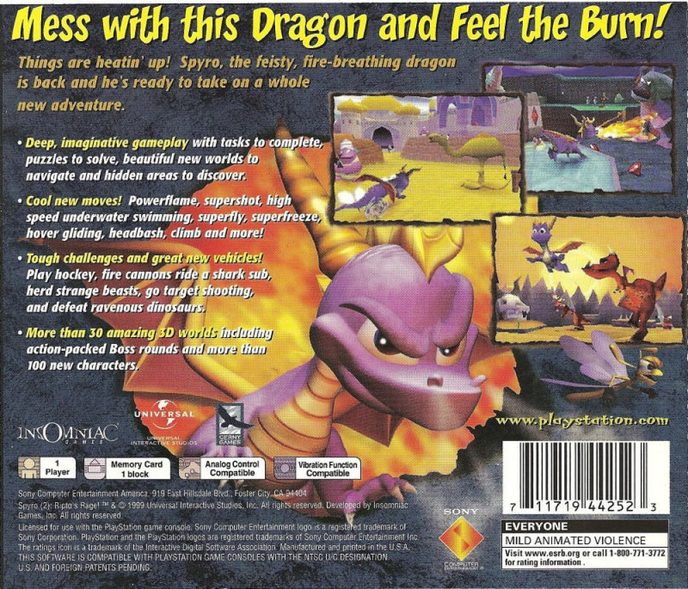 Spyro is back. After successfully rescuing all of the elder Dragons, Spyro is taking a vacation to Dragon Shores--at least that's where thinks he's going. As Spyro, you'll set off on a journey spanning 30 huge worlds full of puzzles, hidden areas, awesome power-ups, and helpless inhabitants just waiting to be rescued. Now Spyro can swim, climb, glide-hover, ground stomp, superfly, supercharge, and superflame. This is a vacation Spyro will not soon forget.