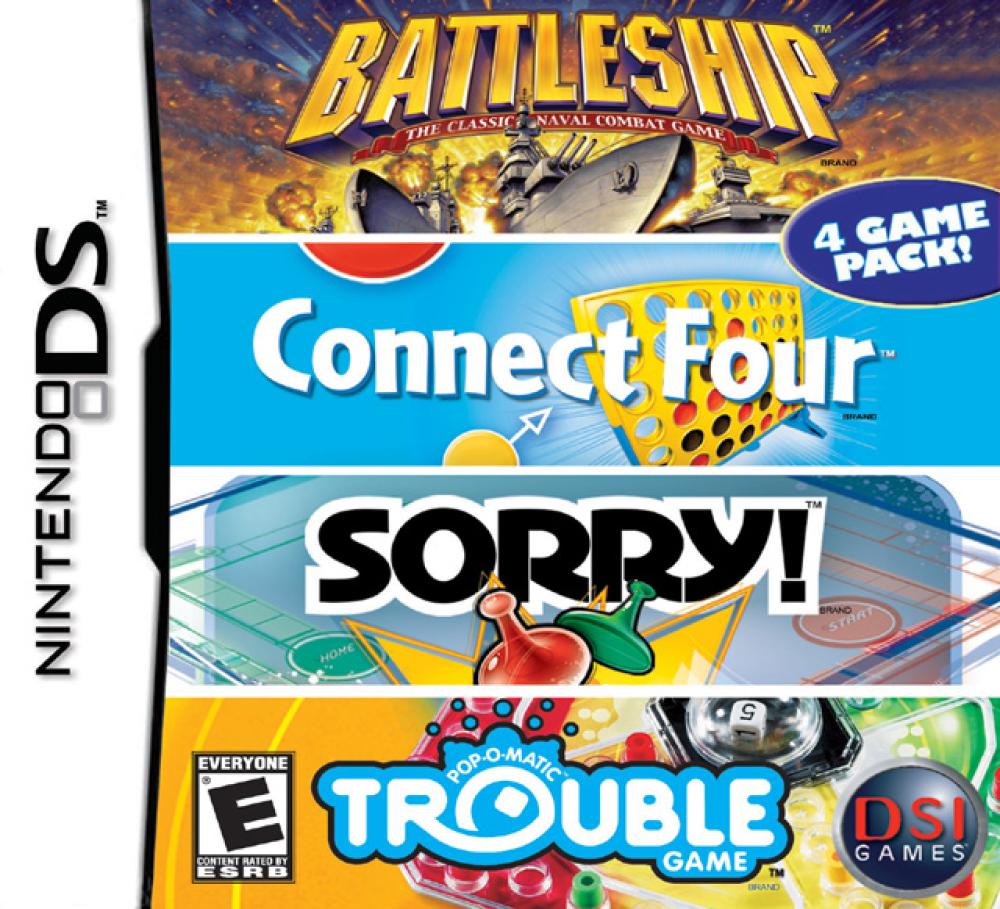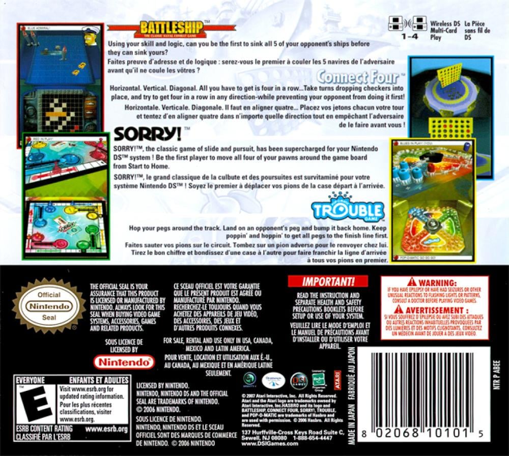 BATTLESHIP Using your skill and logic, can you be the first to sink all 5 of your opponent's ships before they can sink yours? CONNECT FOUR Horizontal. Vertical. Diagonal. All you have to get is four in a row...Take turns dropping checkers into place, and try to get four in a row in any direction-while preventing your opponent from doing it first! SORRY! SORRY!, the classic game of slide and pursuit, has been supercharged for your Nintendo DS system ! Be the first player to move all four of your pawns around the game board from Start to Home. TROUBLE Hop your pegs around the track. Land on an opponent's peg and bump it back home. Keep poppin' and hoppin' to get all pegs to the finish line first.
