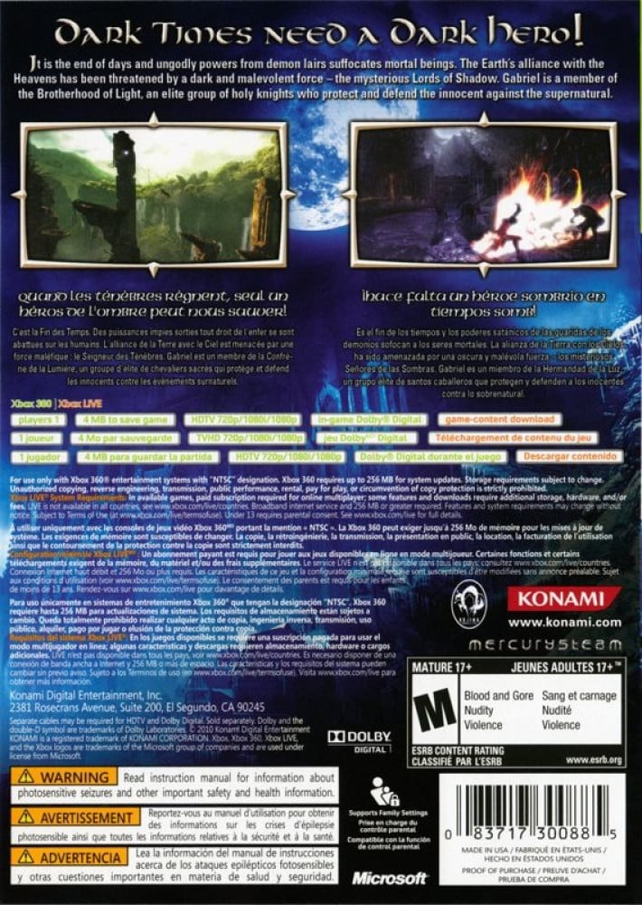 Castlevania: Lords of Shadow takes place at the end of days. The Earth's alliance with the Heavens has been threatened by a dark and malevolent force - the mysterious Lords of Shadow - darkness reins the world. Across this shattered land, the souls of the dead wander unable to find peace, whilst creatures of evil roam free wreaking chaos and death upon the living. Gabriel is a member of the Brotherhood of Light, an elite group of holy knights who protect and defend the innocent against the supernatural. His beloved wife was brutally murdered by the evil forces of darkness and her soul trapped for eternity. Neither living nor dead she realizes the horrific truth of what is at stake and guides Gabriel to his destiny - and hopefully salvation for the world... but at what cost? Thus, Gabriel must travel the destroyed world, defeating the evil tyrants in order to use their powers to bring balance back to the world. Armed with the versatile Combat Cross - the world's last hope must encounter the three factions of the Lords of Shadow and end their unholy rule.