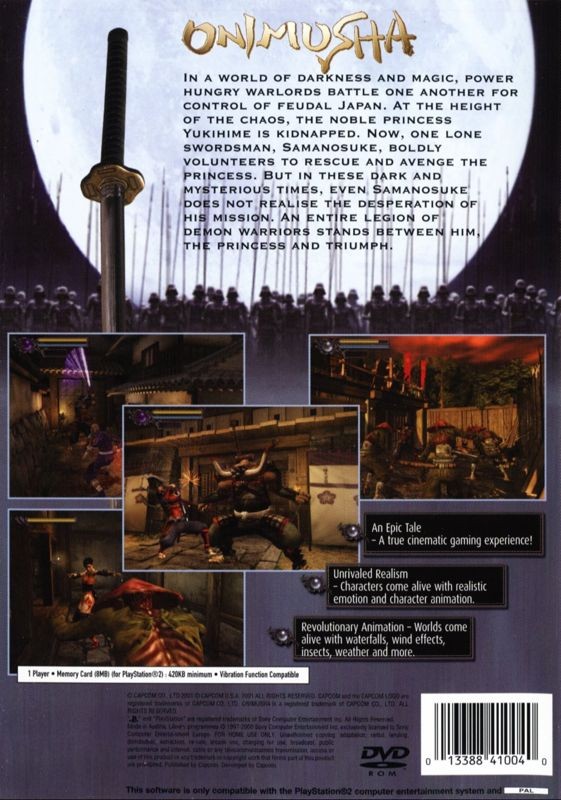 As power-hungry warlords battle one another for control of feudal Japan, a young princess is kidnapped. Now, one lone swordsman, Samanosuke, boldly volunteers to rescue and avenge her. An entire legion of demon warriors stands between you and the princess, so you'll need all your weapons and magic to break through. The world of Onimusha: Warlords comes alive with waterfalls, wind effects, insects, and weather, but in order to triumph, you must stay focused on your mission.