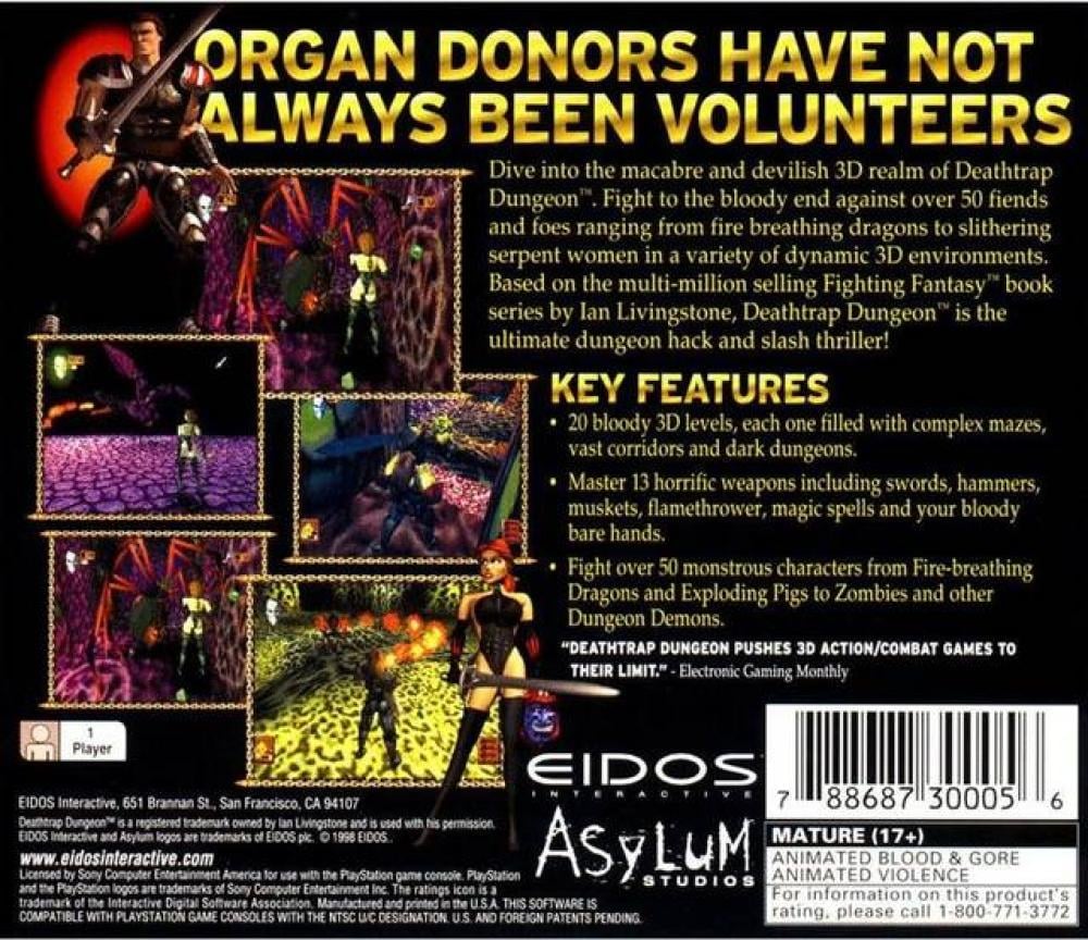 Dive into the macabre and devilish 3D realm of Deathtrap Dungeon. Fight to the bloody end against over 50 fiends and foes ranging from fire-breathing dragons to slithering serpent women in a variety of dynamic 3D environments. Swords and hammers are a few of the weapons at your fingertips as you battle at close quarters in 10 tortuous levels. Based on the multi-million selling Fighting Fantasy book series by Ian Livingston, Deathtrap Dungeon is the ultimate dungeon hack and slash thriller.