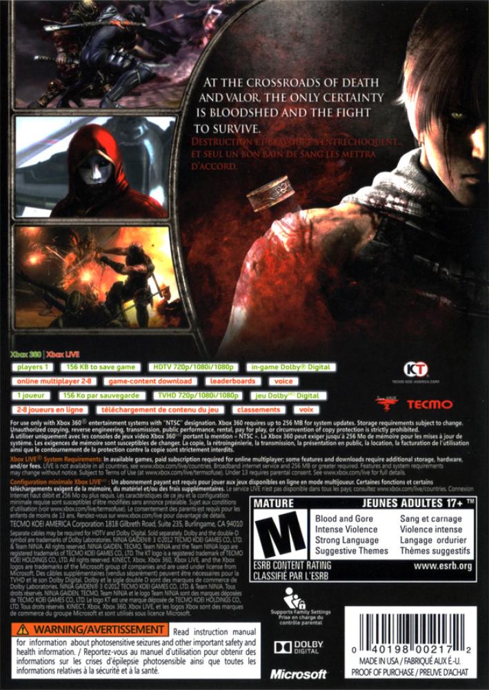 Team NINJA's iconic ninja character, Ryu Hayabusa is set to be unmasked to the world with an all new story, new gameplay and new modes in NINJA GAIDEN 3. This latest installment in the wildly popular series will take players on an unforgettable journey with super ninja Hayabusa once more, but will get a look at the world through Hayabusa's torn eyes, and find out what drives him to fight, defend and kill. Under new leadership from Yosuke Hayabusa, Team NINJA will once again change the way fans think about ninjas - and Hayabusa himself - in this evolutionary game. Ninja Gaiden 3 promises a heightened feeling and experience during close combat fighting, and will also feature online multiplayer, both co-op and competitive, that will add a completely new experience to the NINJA GAIDEN series. Pick up the Dragon Sword once more, sharpen its blade and hone your skills. An adventure unlike any other awaits players
