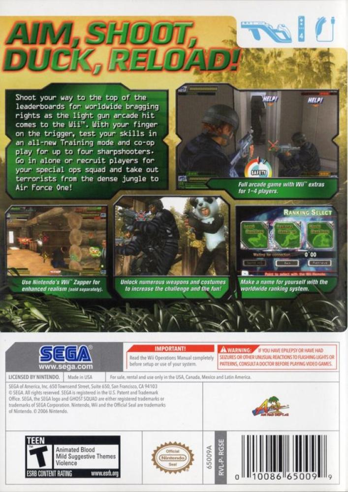 The Ghost Squad is a Special Forces unit established in strict secrecy by the U.N. to combat terrorism and carry out special highly-classified missions without leaving a trace. As an elite member of the Ghost Squad, players will complete dangerous missions such as eliminating terrorist groups, releasing hostages, deactivating bombs, and even rescuing the US President when terrorists hijack Air Force One! Using the Wii Remote, players will utilize revolutionary selectable weapons including a high powered rifle, sub machine and shot gun, or even engage in hand-to-hand combat.