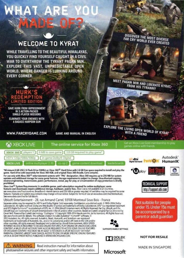 In Far Cry 4, players find themselves in Kyrat, a breathtaking, perilous and wild region of the Himalayas struggling under the regime of a despotic self-appointed king. Using a vast array of weapons, vehicles and animals, players will write their own story across an exotic open-world landscape.