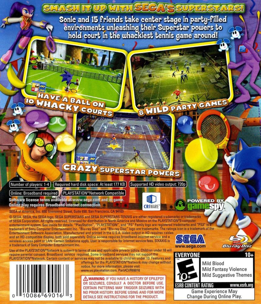 SEGA Superstars Tennis includes over 15 playable SEGA characters - like Sonic The Hedgehog, AiAi from Super Monkey Ball fame, Ulala of Space Channel 5 and Amigo from Samba De Amigo, each of whom have their own unique attributes, and superstar tennis skills. The game's arcade style matches are played out on courts based on environments from Sega games of the past such as the lush tropics of Sonic's Green Hill Zone or the street fair fiesta of Amigo's Carnival Park to name a few.