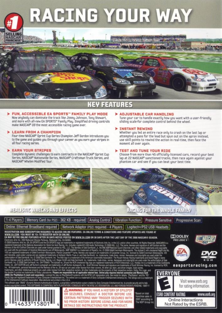 The road to victory begins with Jeff Gordon as he guides you through an all-new "Chase for the NASCAR Sprint Cup" Career Mode on a completely-revamped 3D menu interface. With Jeff's help you can sign big-time contracts, build your reputation and earn valuable performance points by dominating in the NASCAR Craftsman Truck Series, the NASCAR Nationwide Series and the NASCAR Sprint Cup Series. Two new and entirely distinct handling models let you play NASCAR 09 at your speed. Forgiving "Normal" mode is perfect for getting a handle on the game, while "Pro" mode delivers the authentic, white-knuckle NASCAR racing experience. Own the Track lets you compete against your friends and other gamers at all of hte Sprint Cup Series venues. Every racer's stats are compiled and the best driver at each track is named for the ultimate in bragging rights.