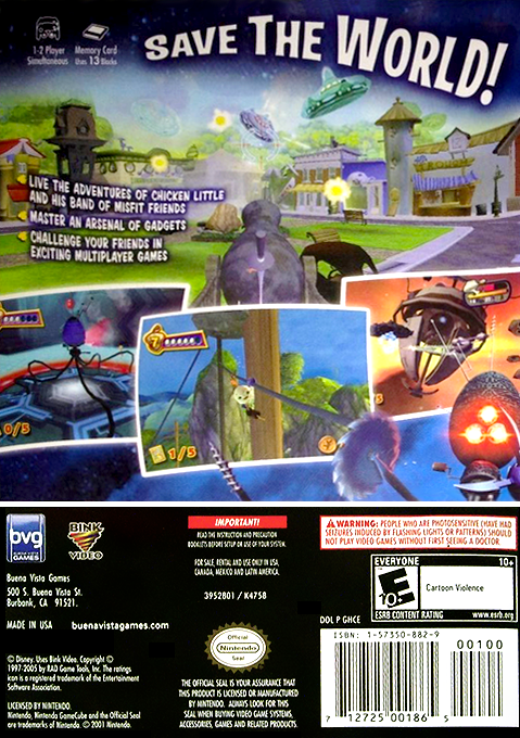 Chicken Little brings you into the middle of Oakey Oaks, where you'll experience all the action and adventure of Disney's animated film of the same name. Taking on the roles of Chicken Little and his friends, Abby Mallard, Runt-of-the-Litter, and Fish-out-of-Water, you must try to outwit bully Foxy Loxy and save the town from an alien invasion, all the while attempting to reverse Chicken Little's tarnished reputation from that unfortunate "acorn incident." The game features innovative gadgets, pickups, side quests, and minigames, plus multiplayer gameplay.