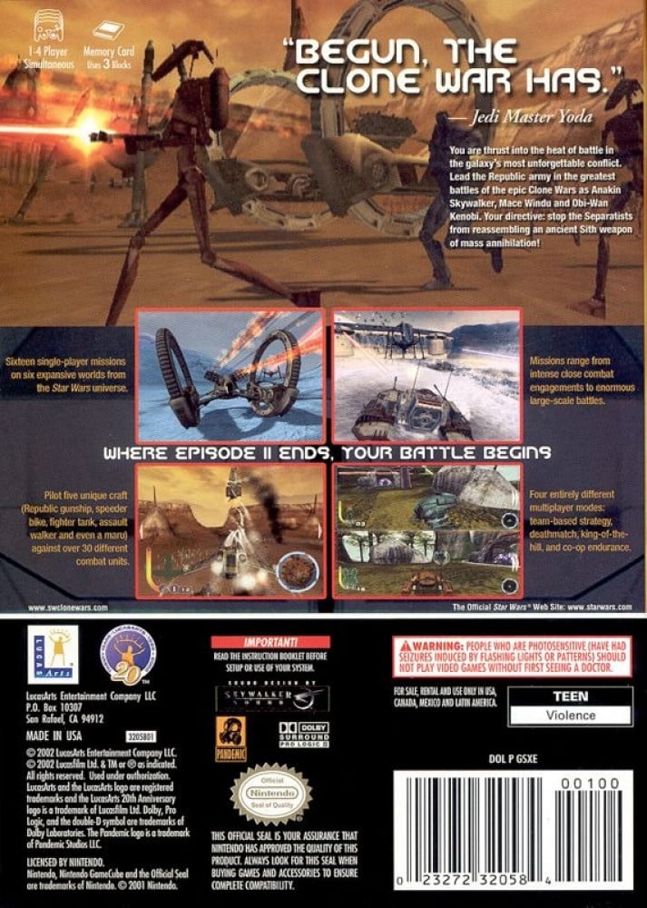 Star Wars: The Clone Wars begins where Star Wars Episode II: Attack of the Clones ends. As Jedi Anakin Skywalker, Mace Windu, or Obi-Wan Kenobi, you lead the Republic Army in the greatest battles of the epic Clone Wars. Your mission is to stop the Separatists from reassembling an ancient Sith weapon of mass annihilation. Then battle for survival in a variety of multiplayer games with up to four players, with Deathmatch, King-of-the-Hill, and even strategic Conquest games. And engage over 30 unique combat units as you wage war across six worlds in the galaxy's most unforgettable conflict.