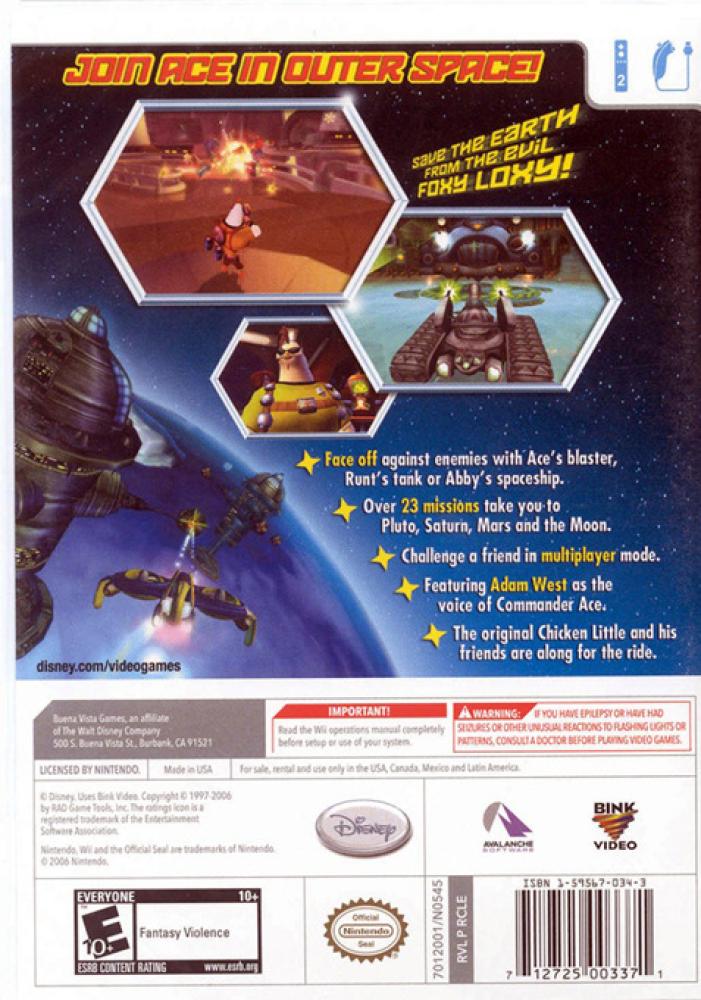 Inspired by the "superhero movie within the movie" finale of Walt Disney Pictures' film "Chicken Little," Disney"s Chicken Little: Ace in Action features Ace, the superhero alter ego of Chicken Little, and the Hollywood versions of his misfit band of friends: Runt, Abby and Fish-Out-of-Water. The crew of the intergalactic Battle Barn faces off against Foxy Loxy and her evil Amazonian sidekick, Goosey Loosey, who have an evil plan to take over Earth. Battle evil alien robots through multiple levels across the solar system and combat your foes in one of three distinct game play modes: Ace on foot as a soldier, Runt as the driver of an armored tank, or Abby as the pilot of a spaceship. The original Chicken Little and his friends Abby, Runt and Fish we know from the film are featured in cut scenes throughout the game.