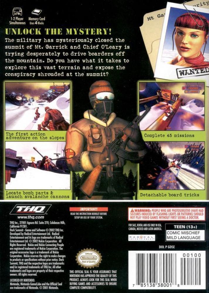 Uncover the mystery atop Mount Garrick! The military has mysteriously closed the summit of Mount Garrick, and the evil Chief O'Leary is trying desperately to drive boarders off the mountain. Do you have what it takes to explore this vast terrain and expose the conspiracy shrouded at the summit? With unique, groundbreaking game design, Dark Summit is the only action-adventure snowboarding game with mission-based objectives and a compelling storyline.