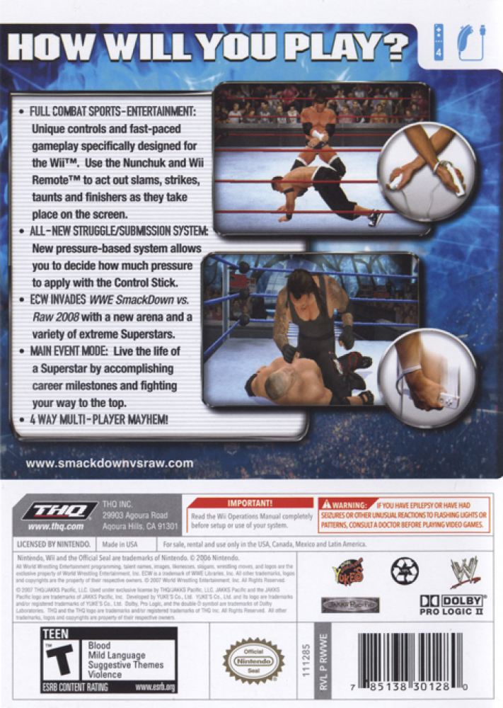 WWE SmackDown! vs. Raw 2008 lets players take the fight into their own hands with the debut of Superstar Fighting Styles. The game features eight unique styles, each having its own strategy and exclusive attributes. A brand new Struggle Submission System gives players intuitive and natural control over their WWE Superstars by using the game's popular analog controls. Realism and strategy are at the forefront, as players now control the amount of pressure they apply to their opponents. In addition, WWE SmackDown! vs. Raw 2008 features a significant Extreme Championship Wrestling (ECW) presence, including a variety of Superstars, arenas and weapons. The game is also packed with significant updates requested by fans, including new rosters, more environmental hotspots, a combined Season and General Manager Mode experience, improved out-of-ring action, enhanced online community support and much more.