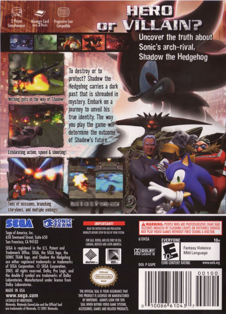 The world is in peril as forces, both good and evil, make a play for the powerful Chaos Emeralds. In Shadow the Hedgehog, you can control Shadow and choose which side to fight for. This 3D platformer lets you use weapons, vehicles, environmental objects, and time and space manipulation to combat your foes.
