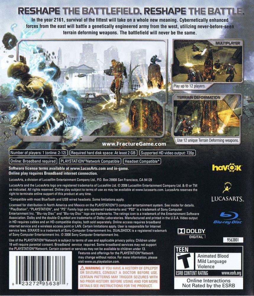 Fracture advances players to the year 2161, where the effects of global warming have altered the planet's landscape, and a clash in ideologies over human enhancement places society on the threshold of war. In utilizing the core gameplay mechanic of Fracture, a destructive next-generation technology known as Terrain Deformation, players are equipped with an arsenal of futuristic weaponry to strategically reshape their surroundings on the fly. Every action they perform dynamically reshapes the earth in ways no videogame has.