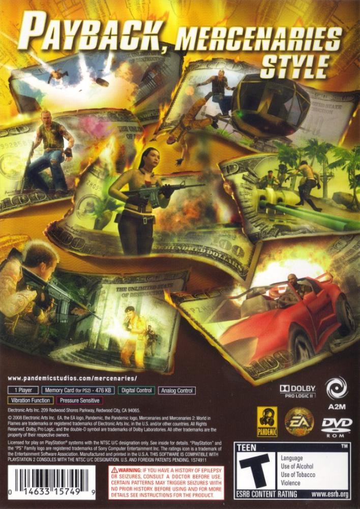 Mercenaries 2: World in Flames is an explosive open-world action game set in a massive, highly reactive, war-torn world. A power-hungry tyrant messes with Venezuela's oil supply, sparking an invasion that turns the country into a warzone. But for you, international crisis is all upside: You are a mercenary, and you profit from chaos. Mercenaries 2 features a slew of potential clients, all willing to pay you to do their dirty work. Dirty deeds, done for exorbitant fees. These are world powers with deep pockets, deep grudges, and enough arms and ammo to start World War III. This is your kind of environment. Mercenaries 2 features the latest and most dangerous in civilian and military tech, everything from shiny new sports cars, to the future-tech satellite-guided bunker-busting mini-nuke. Tanks, APCs, boats, luxury automobiles - you name it, you can have it delivered to you in real time. And if you run out of cash you can always 'acquire' the gear you need in the field. If you see it, you can buy it, steal it, or blow the living crap out of it. Play your own way, or play with the help of a friend in the new cooperative multiplayer mode. You are not a soldier. You don't have to play by anyone's rules. You have your own code: you will fulfill the terms of the contract, no matter what. Not everyone in the world of Mercenaries is as honorable. Everyone will try and screw you, given the chance. They think they can get away with it, because they don't know rule #1: EVERYBODY PAYS.