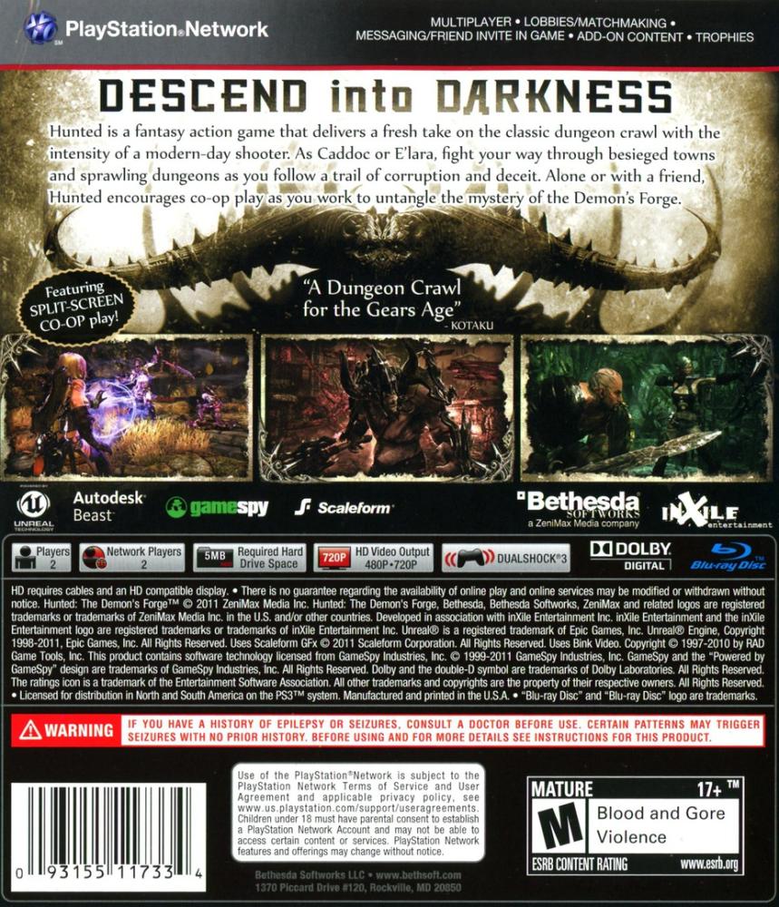 Set in a dark fantasy world, Hunted: The Demon's Forge is an unforgettable cooperative action game, pitting you and your partner against waves of vicious enemies. Taking control of either E'lara, a ranged weapon expert, or Caddoc, a master swordsman, you must use a variety of weapons, powerful spells, and cover tactics to battle your way through menacing dungeons, overgrown ruins, and downtrodden towns. Discover secrets and complete co-op-based puzzles whilst exploring the sinister world to discover answers to the game�s deep, dark mysteries. The dark ages have become corrupted. Heinous creatures have emerged from underground. Townsfolk across the land are disappearing. Upon the promise of their fortune in gold, mercenaries E'lara and Caddoc take on the daunting task of discovering where the innocent villagers have been taken. Their journey will lead them on a dark and twisted path where they will encounter death, slavery, and sacrifice. Travel deep within the world of Kala Moor...and to the secrets of The Demon's Forge.