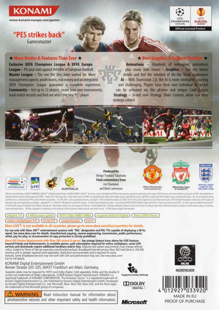 Pro Evolution Soccer is a video game built on pride, the pride that comes from making the most realistic soccer experience one can have within the world of gaming. Pro Evolution Soccer 2010 does not disappoint and this year, the voices of fans world-wide have been heard. Based in Japan, Winning Eleven Productions has instituted a host of anticipated changes that make PES 2010 the best yet. In PES 2010 you'll find yourself on the largest stage in digital soccer: The Champions League. Imagine you're in a 1-1 tie in stoppage time against Manchester United. You've broken their defense and are sprinting full throttle into a man to man match of wits and reflexes with Edwin van der Sar... Do you have what it takes to punch it in for the win?
