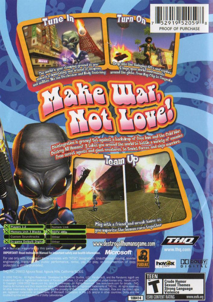 Destroy All Humans! 2 takes the irreverent Sci-Fi action gaming experience into the swinging sixties with all new game features, expanded open-world gameplay and co-op multiplayer. Assuming the role of the Furon Scout - Crypto 137 - players will embark on another mission to earth to take on the world of free love, the Cold War and other 60's era icons. In Destroy All Humans! 2 Players have access to an upgraded arsenal of weapons and enhanced mental abilities while they battle a variety of new enemies from secret agents and giant creatures to Soviet Forces and ninja warriors.