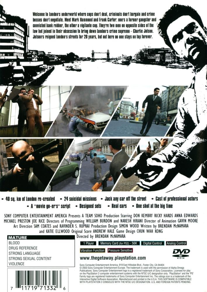 The Getaway follows the story of two men from opposite sides of the law, who share an obsession of bringing down London's crime supremo. You'll play Mark Hammond (an ex-bank robber on the run for murdering his wife and kidnapping his child) and Frank Carter (a vigilante cop who was suspended from the Flying Squad) in multiple storylines set in London. Within the city's winding streets, indoor environments, and dangerous street corners, you must search for the manipulative crime boss and finally clear your name.