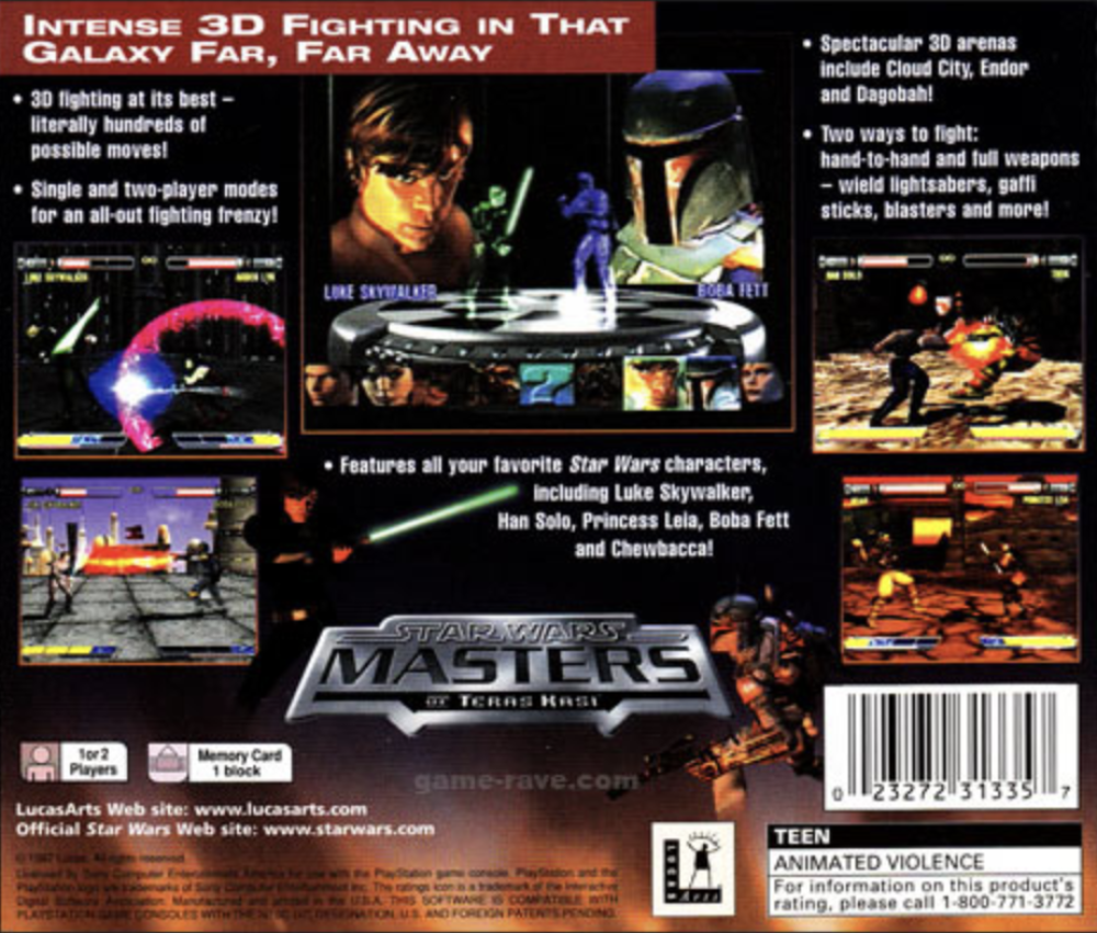 Intense 3D Fighting in that galaxy far, far away... with 3D fighting at its best, literally hundreds of possible moves! Single and two playermodes for an all out fighting frenzy! Spectacular 3D arenas include Cloud City, Endor, and Dagobah! Theres two ways to fight: Hand to hand and full weapons - wield lightsabers, gaffi sticks, blasters, and more! Featuring all of your favorite Star Wars characters, including Luke Skywalker, Han Solo, Princess Leia, Boba Fett, and Chewbacca, its Star Wars: Masters of Teras Kasi!