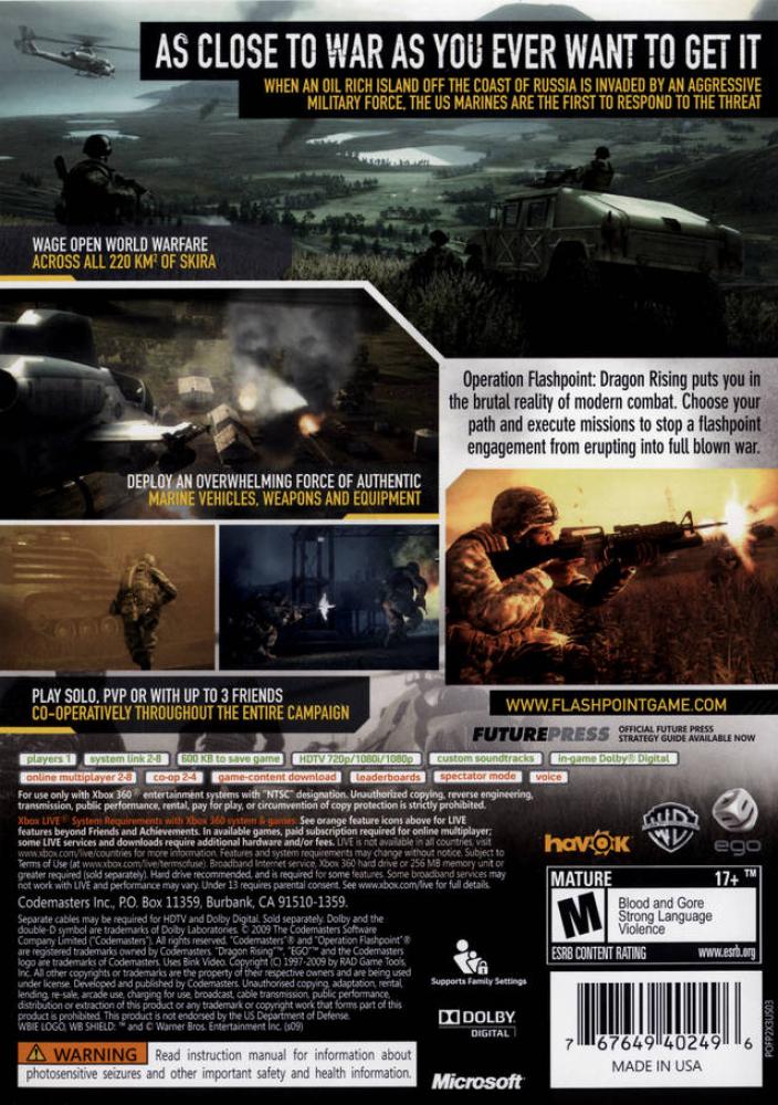 In Operation Flashpoint: Dragon Rising gamers play the decisive role in defusing a military flashpoint between two global superpowers that threatens the entire world. Players take the role of US Marines and Special Forces operatives dispatched to take back the oil-rich Russian island of Skira from an invading force of Chinese PLA. The 220km² island becomes the ultimate open-world battlefield as players are empowered to make their own choices, deploy their own tactics and fight war on their own terms. Objectives are set - how they are accomplished is always up to the player who has the full resources of the US Marine Corps at their disposal and the ability to attack from any direction. Intelligent squad and enemy AI, based on authentic military tactics, react in real-time to situations as they unfold to ensure that no two games will ever play out the same. Players will become immersed in a stunningly realistic conflict with unprecedented levels of detail, freedom and authenticity. Every decision counts, every action has a consequence and every bullet can kill as Operation Flashpoint: Dragon Rising recreates the lethality, tension and adrenaline of real war like never before.